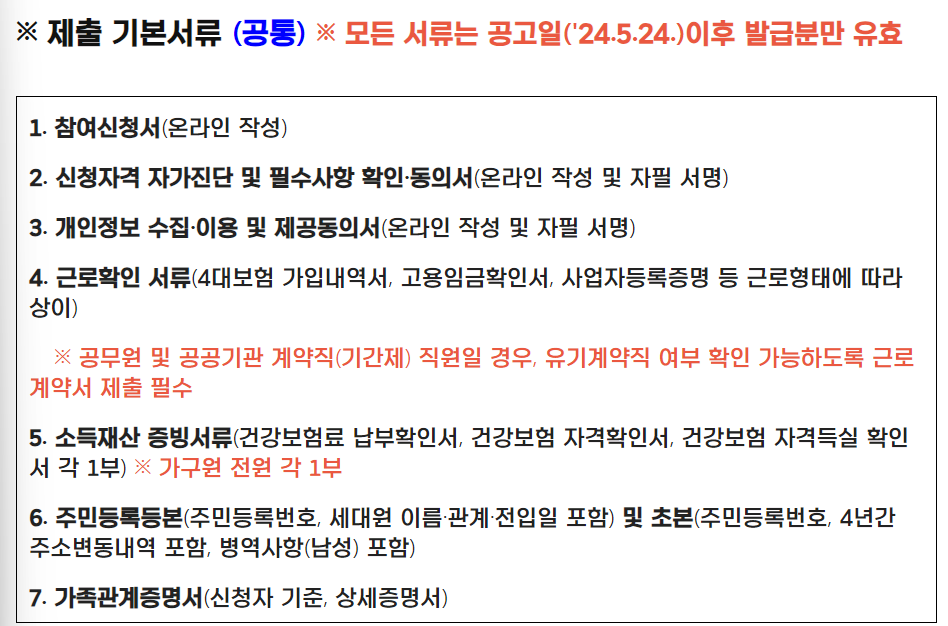 2024 경기도 청년 노동자 통장은 필수서류를 제출해야 합니다. 또한 모든 서류는 2024년 5월 24일 이후 발급된 서류여야만 합니다. 만약 가산점에 해당하는 사람이라면 추가서류를 함께 제출해야 가산점을 받을 수 있습니다.
